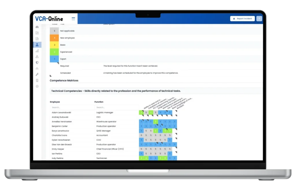 De competentiematrix biedt een duidelijk visueel overzicht van kwalificatieniveaus per medewerker, team of functie en helpt HR-, HSE- en operationele verantwoordelijken te verifiëren of medewerkers competent en bevoegd zijn voor hun taken.