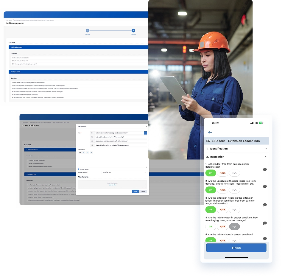 Kontrola środków trwałych umożliwia organizacjom przeprowadzanie uporządkowanych inspekcji narzędzi i wyposażenia — zarówno w aplikacji webowej, jak i bezpośrednio za pośrednictwem aplikacji mobilnej. Inspekcje są realizowane przy użyciu konfigurowalnych szablonów, które definiują rozdziały, pytania wielojęzyczne, elastyczne grupy odpowiedzi oraz opcjonalne komentarze lub załączniki. Zapewnia to spójny i ustandaryzowany proces we wszystkich lokalizacjach, kategoriach środków trwałych i zespołach.