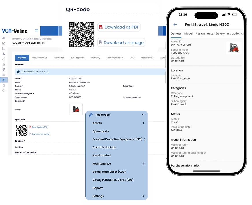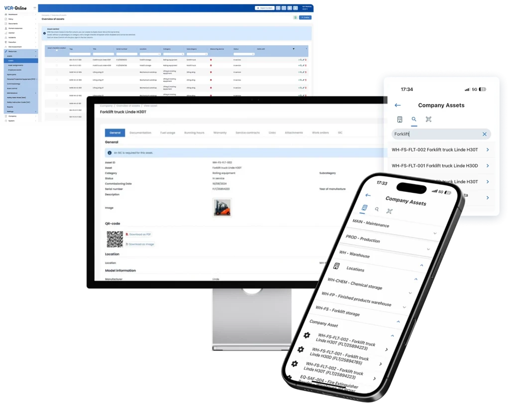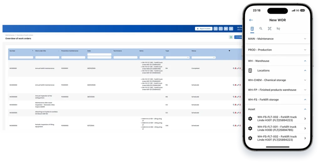 Zarządzaj narzędziami, maszynami, instalacjami oraz sprzętem dźwigowym w jednym centralnym systemie. Planuj inspekcje prewencyjne, planuj konserwację, twórz zlecenia pracy oraz wykonuj szybkie kontrole środków trwałych za pomocą kodów QR — w pełni identyfikowalne i przyjazne dla urządzeń mobilnych.