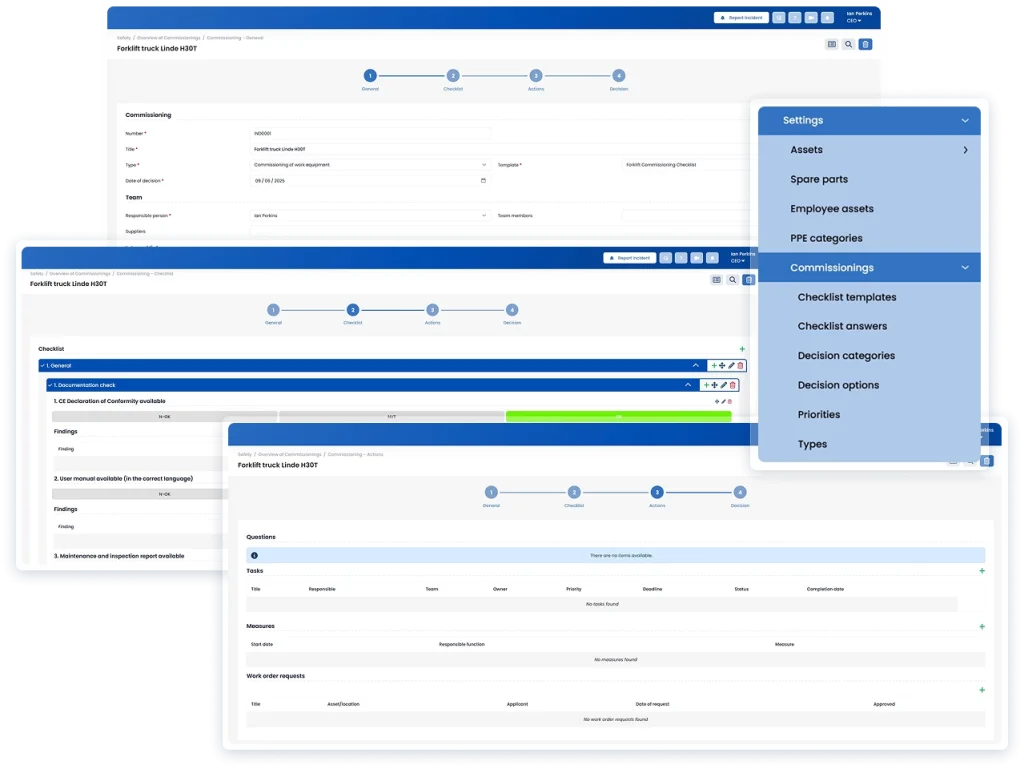 Korzystając z szablonów uruchomienia, użytkownicy podążają za prowadzonym procesem w celu weryfikacji dokumentacji, wymagań bezpieczeństwa oraz warunków technicznych. Deklaracje CE, instrukcje obsługi, raporty z inspekcji oraz kontrole specyficzne dla organizacji są sprawdzane w przejrzystej strukturze checklist. Wszelkie ustalenia są natychmiast rejestrowane i mogą uruchamiać zadania lub zlecenia pracy, gdy wymagane są działania przed dopuszczeniem środka trwałego do użytkowania.