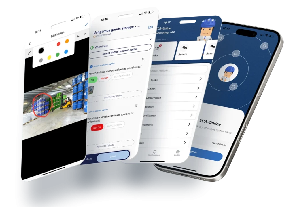 A aplicação móvel VCA-Online permite o registo offline de inspeções no local de trabalho, observações e comunicações de incidentes. Os dados são armazenados de forma segura no dispositivo e sincronizados automaticamente assim que a ligação volta a estar disponível.